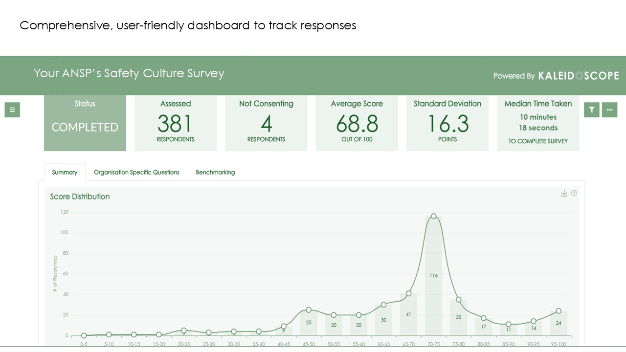 Kaleidoscope is a proprietary tool run by Firstfruits Services, available to ANSPs completing Tier 3 of the survey on a licenced basis. Kaleidoscope’s capabilities include real-time data analytics, automatic dashboards, correlations and filters, AI analysis, multi-language support, pulse testing, time-series analysis to evaluate effectiveness of implemented solutions, and more.