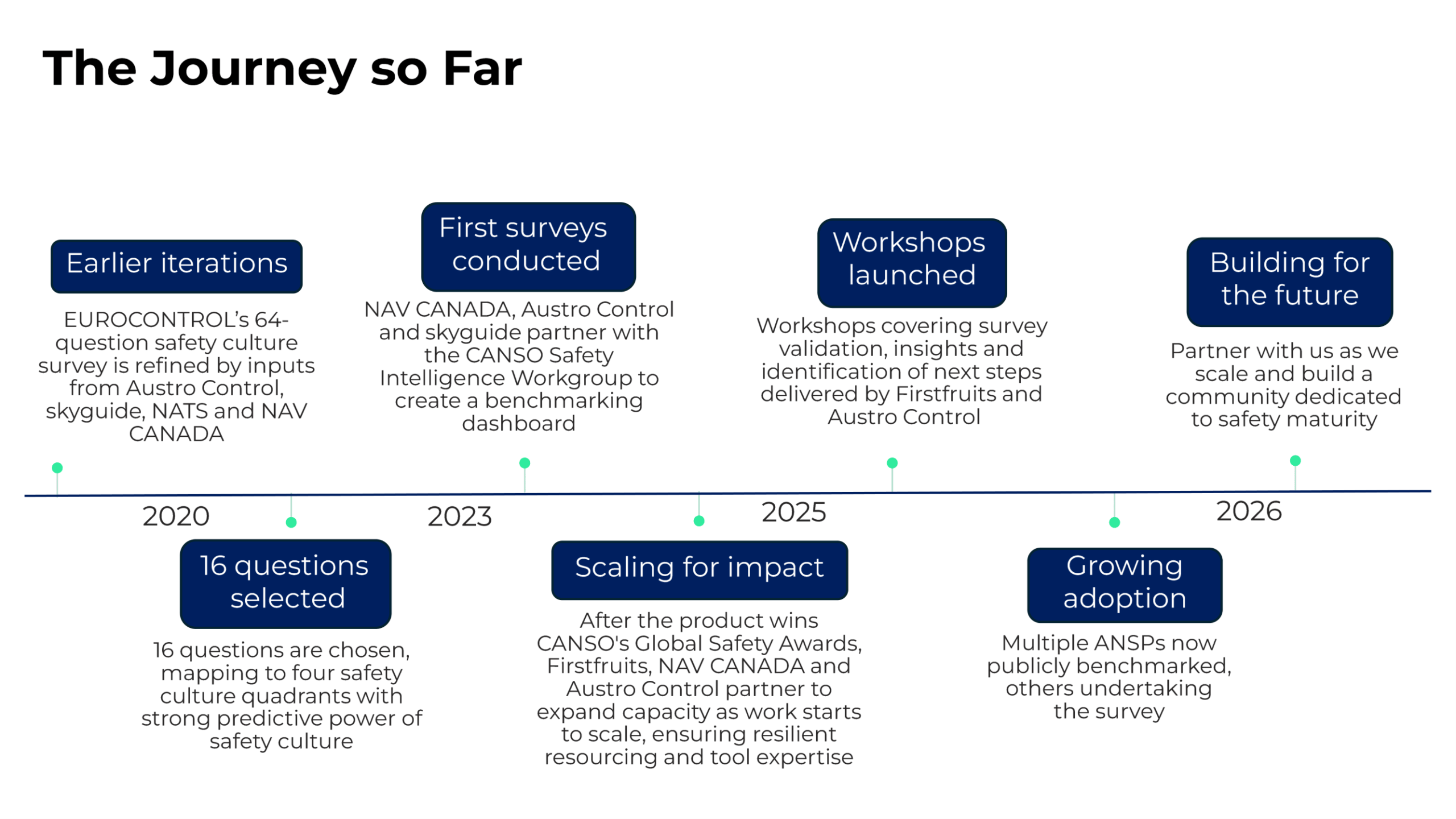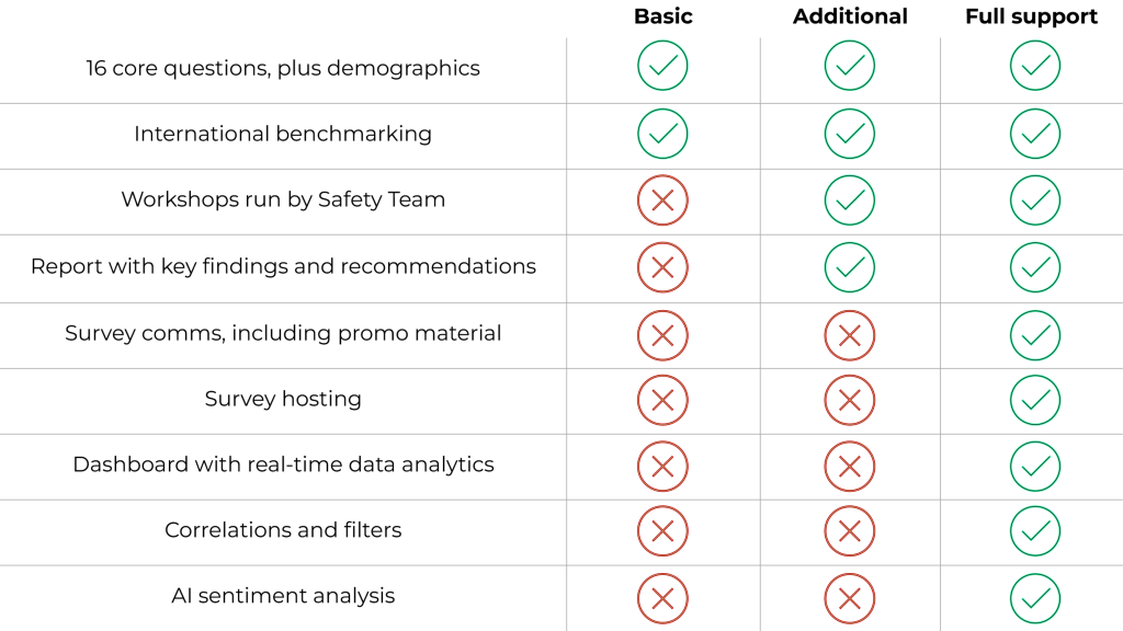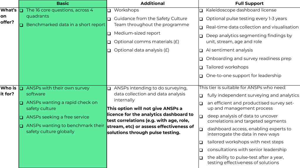 You will receive the benchmarking benefits for free – this is by CANSO and for CANSO, aiming to increase safety culture maturity globally. The question is whether you would benefit from external expert provision of the workshops, independent analytics, dashboarding, additional qualitative questions, or set-up of an “engine” of cultural change. We have kept the costs for these additional steps as low as possible to work towards the overall goal. To find out more about each tier and receive guidance on which might be best for you, please don’t hesitate to contact the Safety Team.